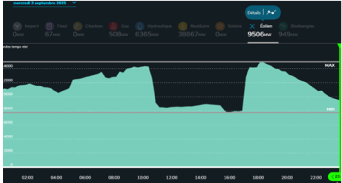 Second exemple (graphique 2) le 3 septembre 2025, jour de grand vent, une part importante des sites éoliens est mise à l’arrêt en raison de la surproduction.